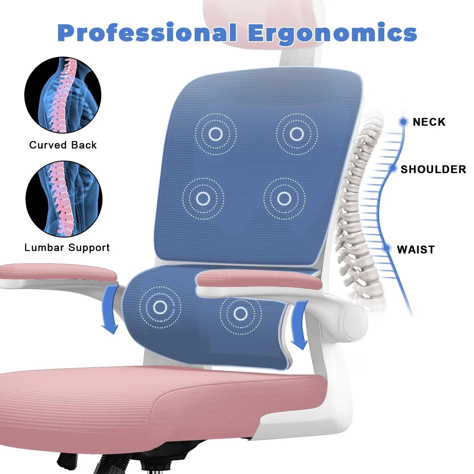 --Flip-up Armrests: The armrests can be turned up and down at will. When you are leaning back in the chair to have a rest, the padded armrests are perfect for supporting your elbows. Or when you don’t need to use the chair, you can flip up the armrests and push the chair under the desk to save space.