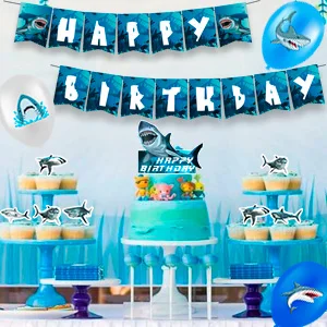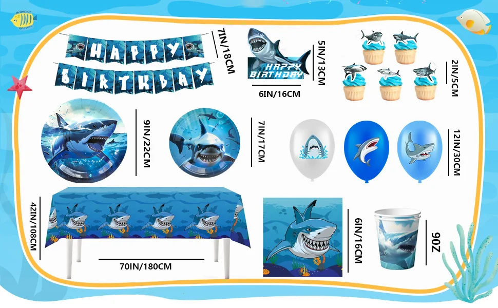 Our shark party supplies have a total of 67 pcs shark party decorations including 1 shark birthday banner, 12 shark balloons, 1 shark cake topper, 12 shark cupcake toppers, and 10 9'' shark party plates, 10 7'' shark party plates 10 shark party napkins and shark party tableware set etc shark party decor.